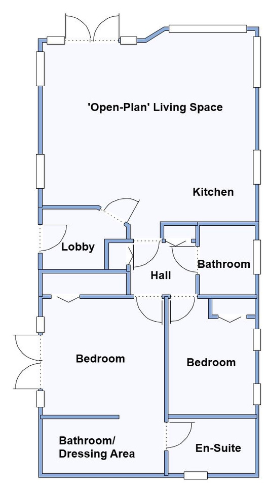 ‘Open-Plan’ Living Space: approx 18’8” x 16’9” max. A large, bright & airy room with vaulted ceiling, sky light window & double doors to rear garden. LED spot lights. Feature fireplace & Laminate flooring.